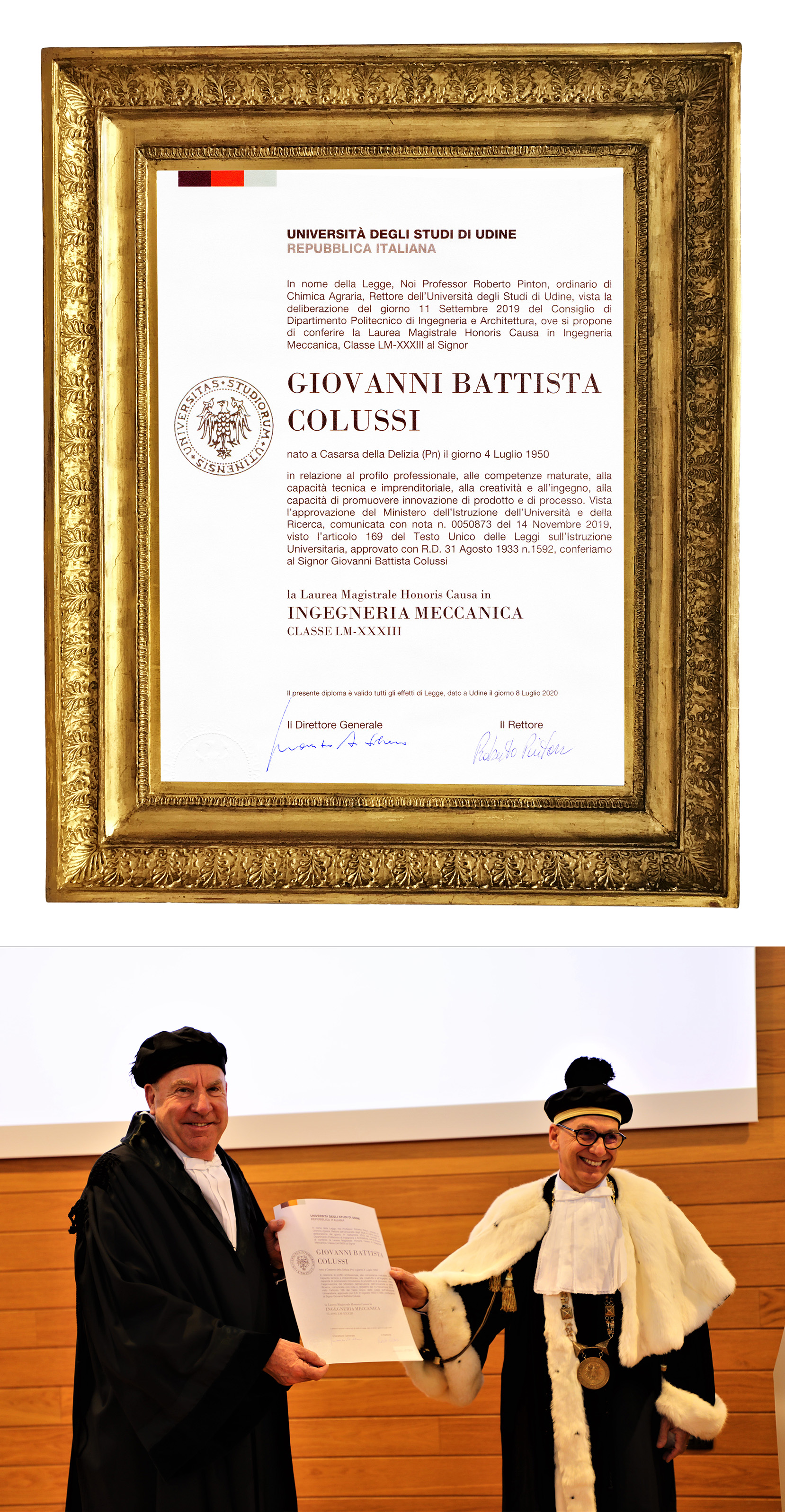 Udine, 8 de julio de 2020 – La Universidad de Udine ha otorgado el título honorífico en Ingeniería Mecánica a Giovanni Battista Colussi, que cumplió 70 años el 4 de julio, inventor y empresario líder a nivel mundial en el sector de los sistemas de lavado y sanitarización industrial. El título académico honorario más importante fue otorgado a Colussi, como se indica en la motivación, «por su perfil profesional, las habilidades adquiridas, la capacidad técnica y empresarial, la creatividad y el ingenio, la capacidad de promover la innovación de productos y procesos».